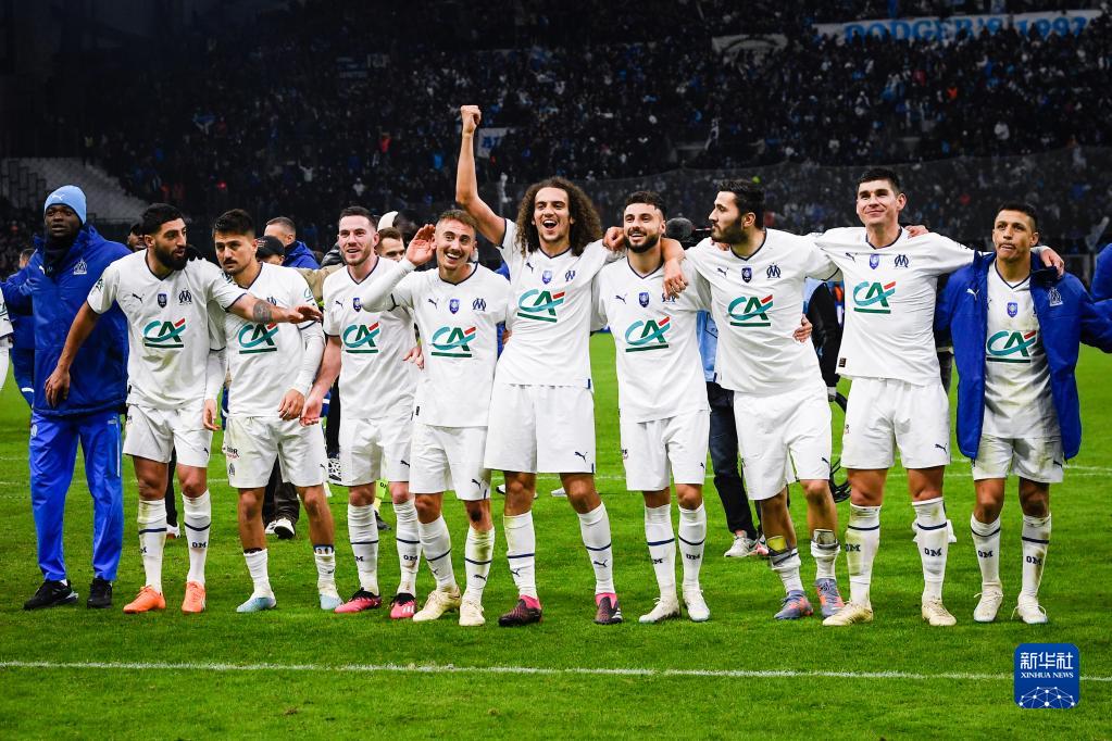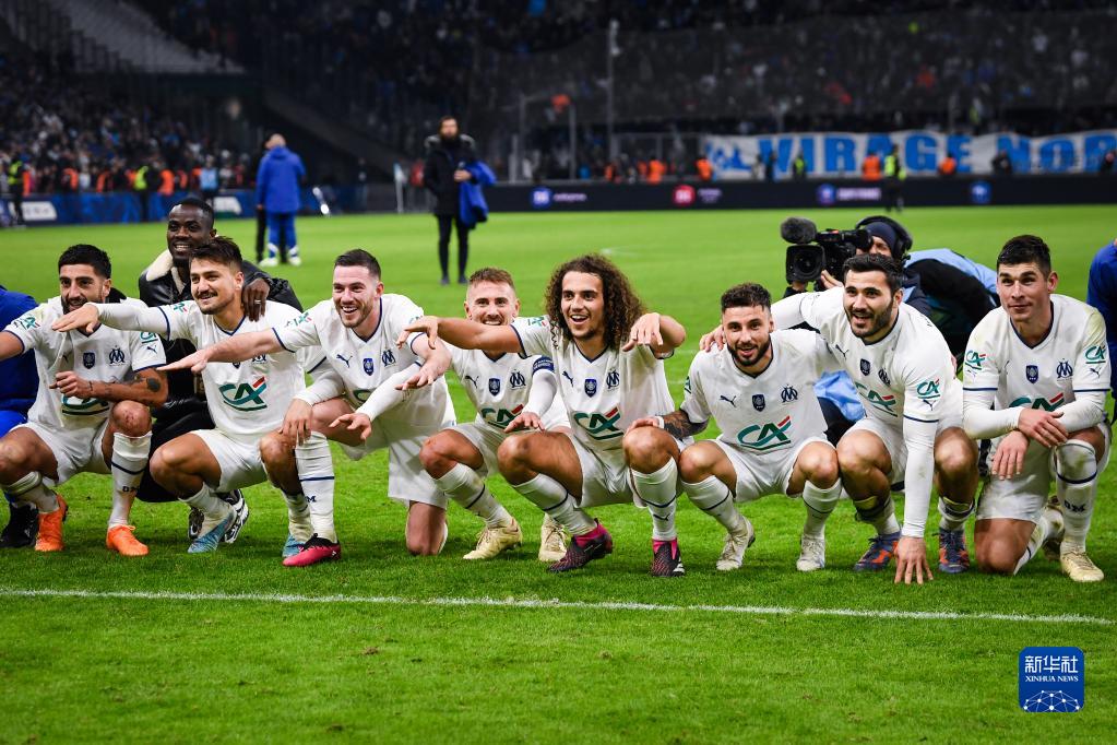 2月8日,马赛队球员庆祝进球。新华社发(克莱芒·马乌铎摄)