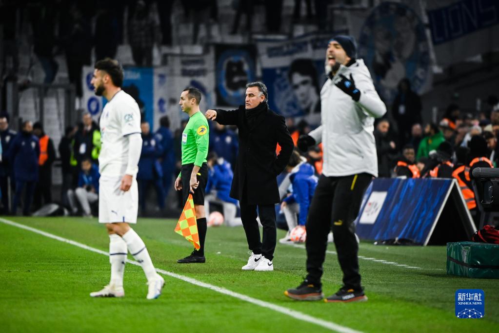 2月8日,巴黎圣日尔曼队主教练加尔蒂埃(右二)和马赛队主教练图多尔(右一)在比赛中。新华社发(克莱芒·马乌铎摄)