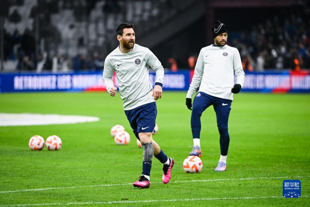 2月8日,巴黎圣日耳曼队球员梅西(左)和内马尓在赛前热身。新华社发(克莱芒·马乌铎摄)