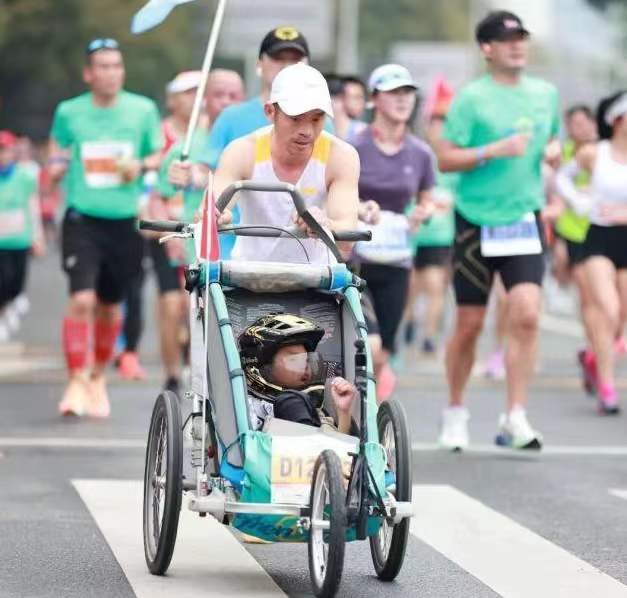 罗书坚开始练习跑步,从一个“小白”开始,慢慢成为马拉松跑者。从2015年开始,他推着儿子跑过了杭州、北京、上海、广州、深圳等20多个城市。