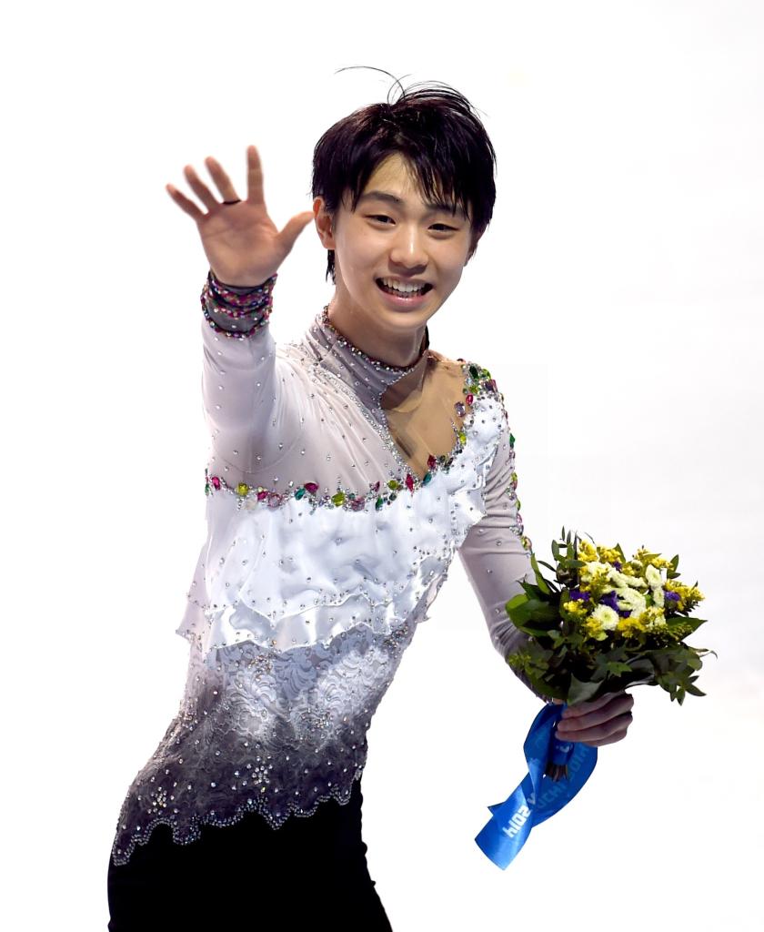 图为2014年2月14日,羽生结弦在2014年索契冬奥会花样滑冰男子单人滑项目的献花仪式后向观众挥手致意。新华社记者王毓国摄