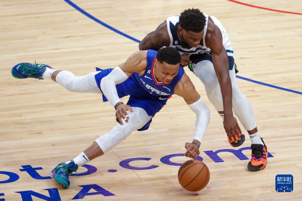 2月28日,快船队球员拉塞尔·威斯布鲁克(左)与森林狼队球员安东尼·爱德华兹在比赛中拼抢。新华社发(赵汉荣 摄)