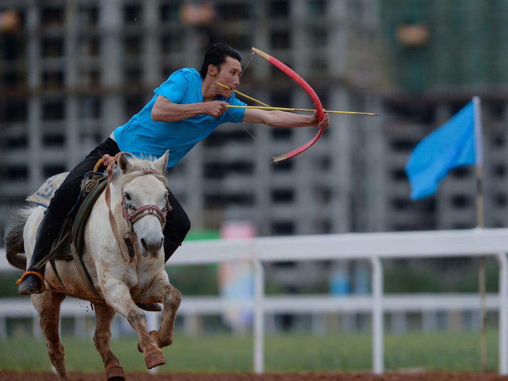 2021年9月16日,海北州选手才仁他日在骑马射箭比赛中。新华社记者 张曼怡 摄