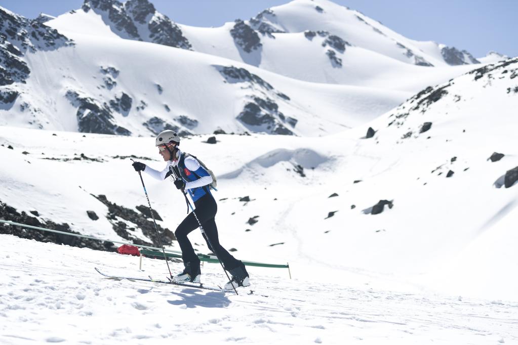 2019年5月24日,青海·岗什卡第二届高海拔世界滑雪登山大师赛参赛选手朱斌在比赛中向上攀爬。新华社记者 吴刚 摄