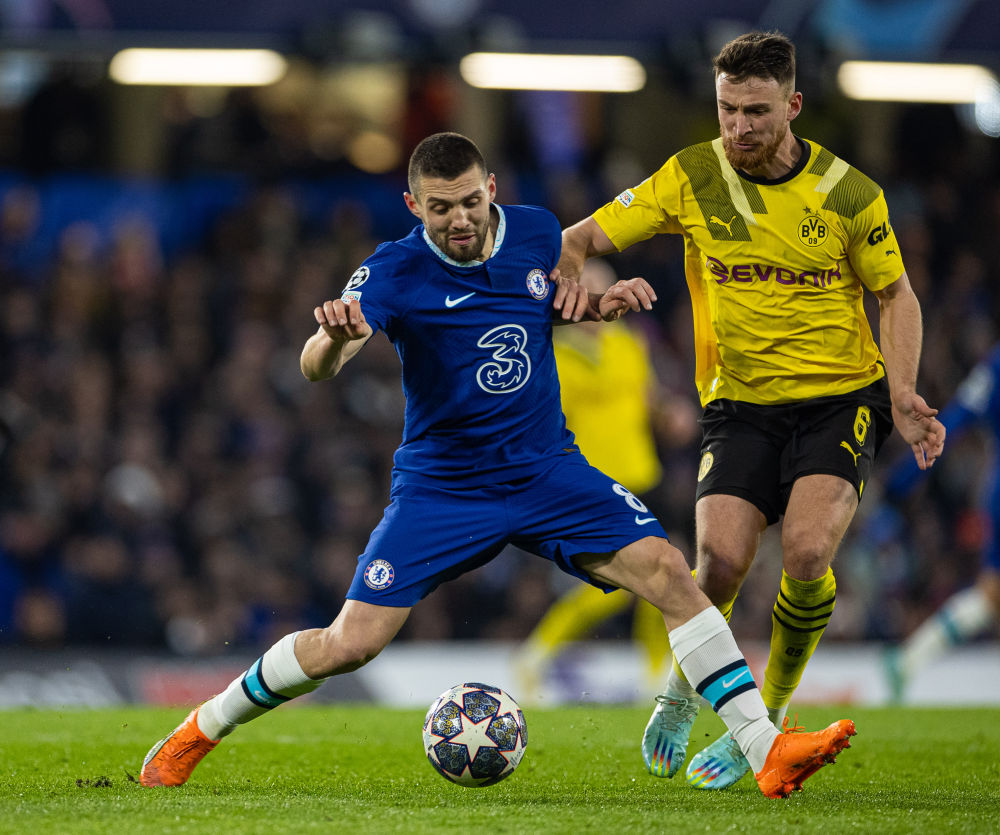3月7日,切尔西队球员科瓦契奇(左)与多特蒙德队球员厄兹詹拼抢。新华社发