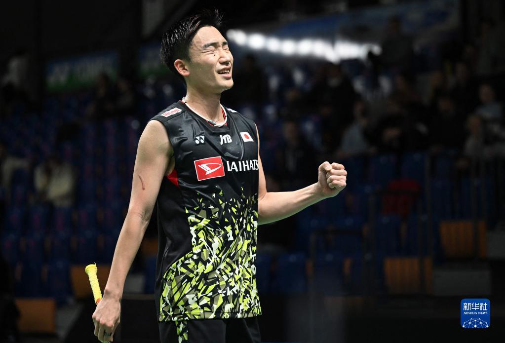 3月8日,日本选手桃田贤斗在获胜后庆祝。桃田贤斗以2比0战胜中国选手石宇奇,晋级第二轮。新华社/法新