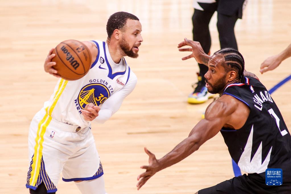 3月15日,快船队球员科怀·伦纳德 (右) 在比赛中防守勇士队球员斯蒂芬·库里。新华社发(赵汉荣摄)