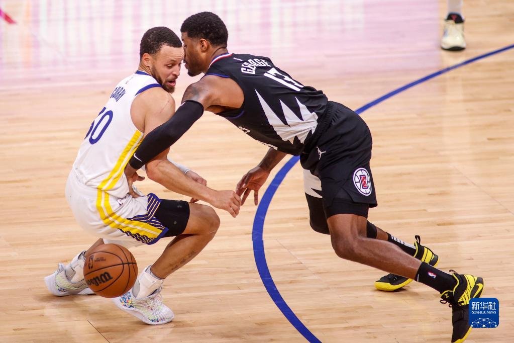 3月15日,勇士队球员斯蒂芬·库里 (左) 与快船队球员保罗·乔治在比赛中拼抢。新华社发(赵汉荣摄)