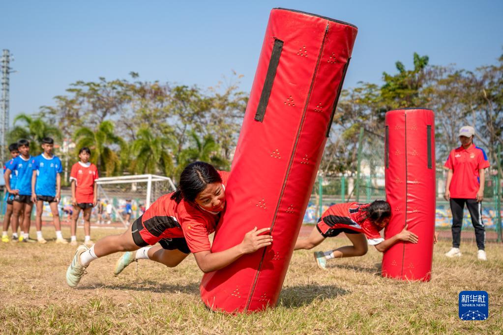 景洪市一中橄榄球队队员在进行比赛训练(2月14日摄)。新华社记者 陈欣波 摄