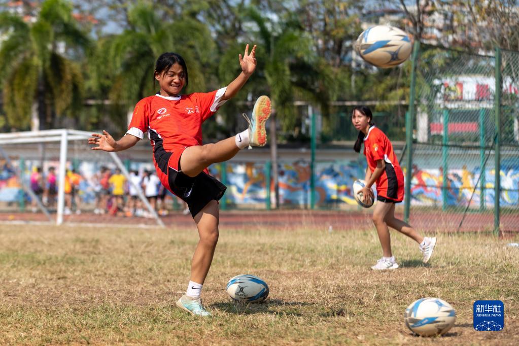 景洪市一中橄榄球队队员查晓慧(左)在训练中练习踢橄榄球(2月13日摄)。新华社记者 陈欣波 摄