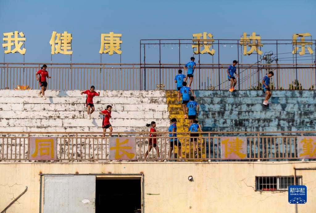 景洪市一中橄榄球队队员在台阶上进行训练(2月14日摄)。新华社记者 陈欣波 摄