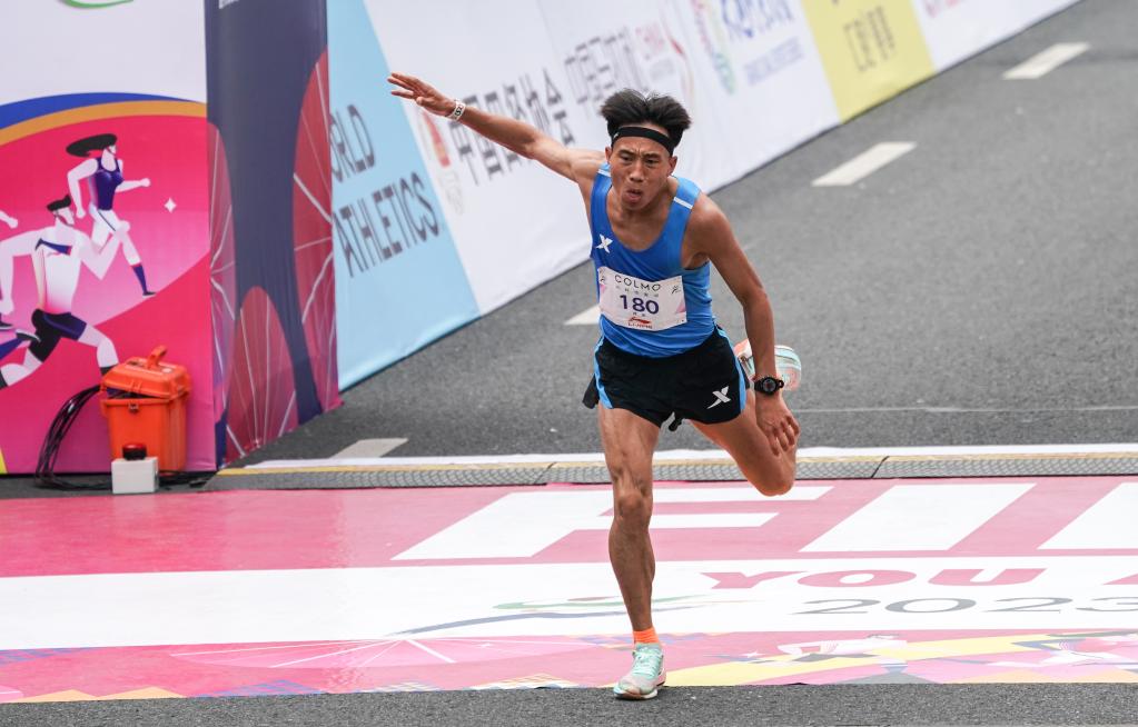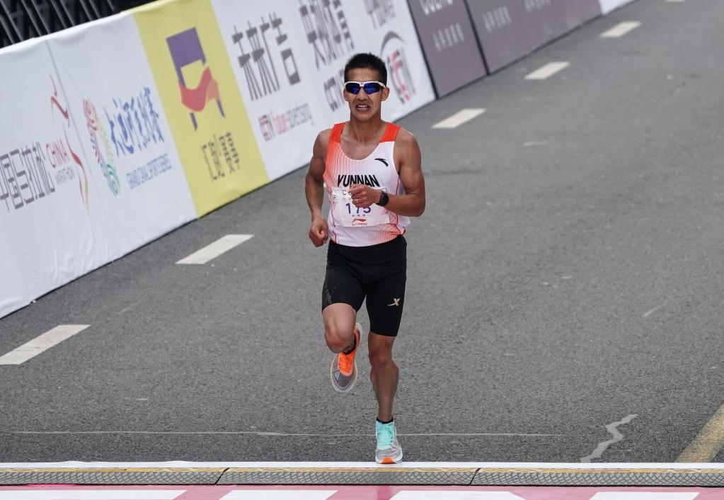 ↑3月19日,杨绍辉在比赛中冲过终点线。新华社记者杨磊摄