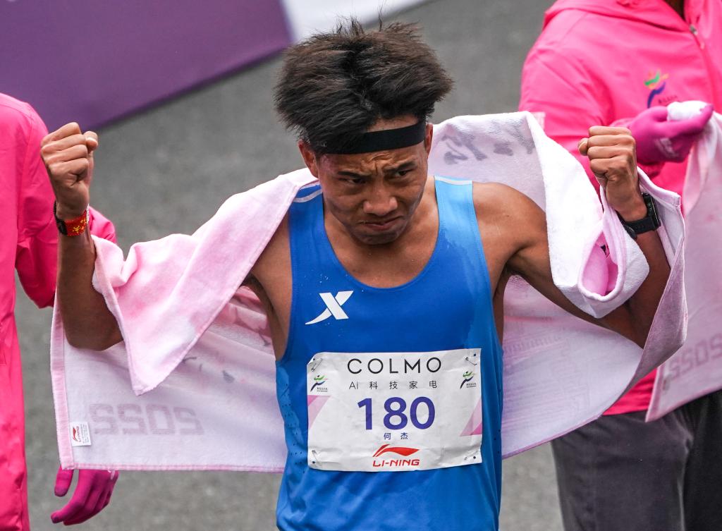 ↑3月19日,何杰在比赛中冲过终点线。新华社记者杨磊摄