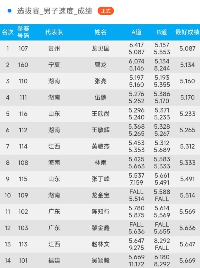 龙见国更是接连爬出5秒04、5秒00