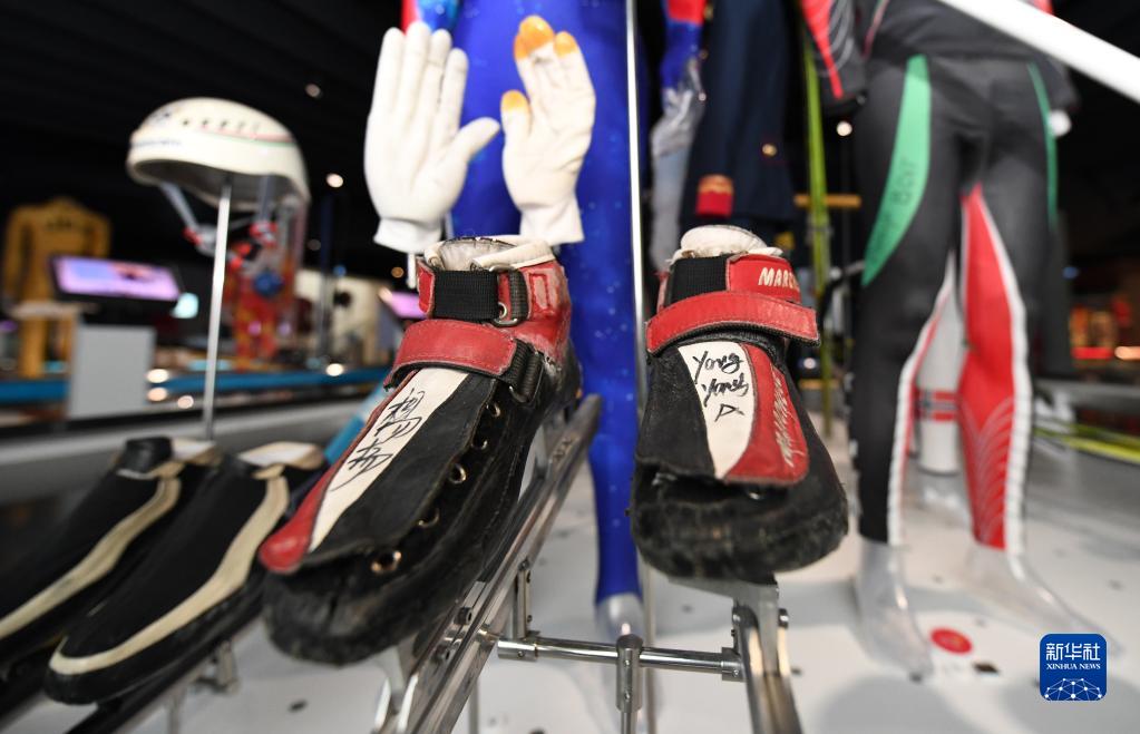 这是3月21日在国际奥林匹克博物馆内拍摄的中国首枚冬奥会金牌得主杨扬使用过的运动装备。新华社记者 连漪 摄