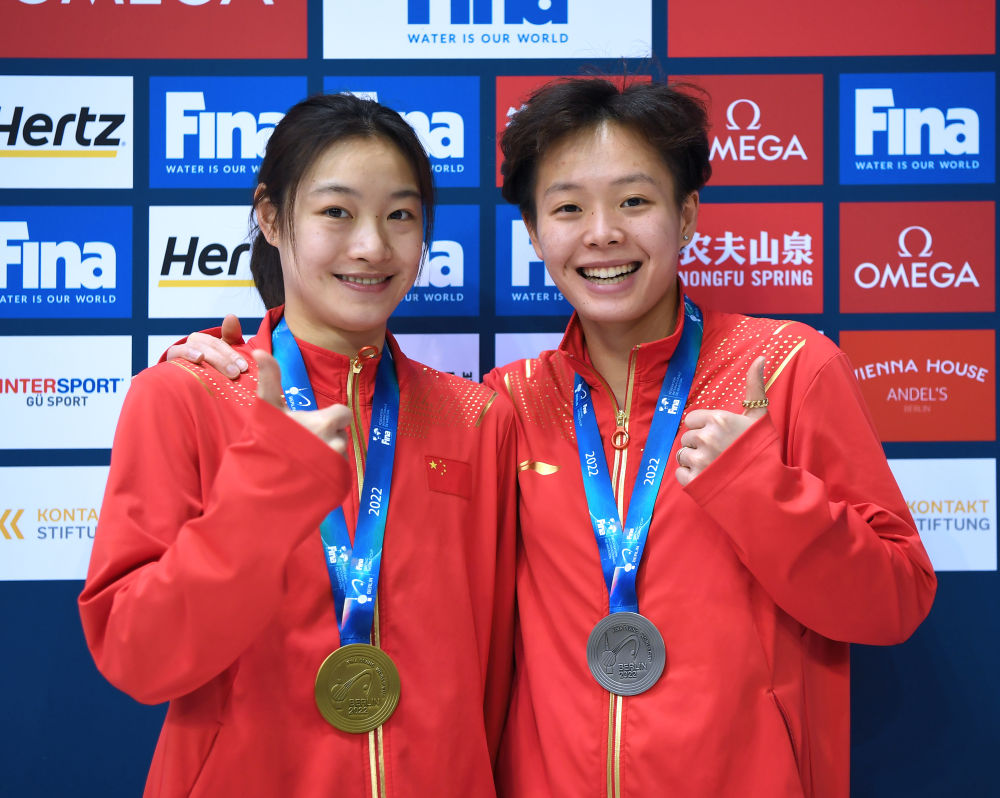 2022年10月23日,在德国柏林举行的2022年跳水世界杯女子3米板决赛中,中国选手昌雅妮、陈艺文包揽冠亚军。新华社记者 任鹏飞 摄