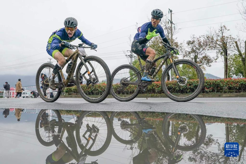 3月25日,迪卡侬ROCKRIDER车队车手苏俊(右)在比赛中。新华社记者 杜宇 摄