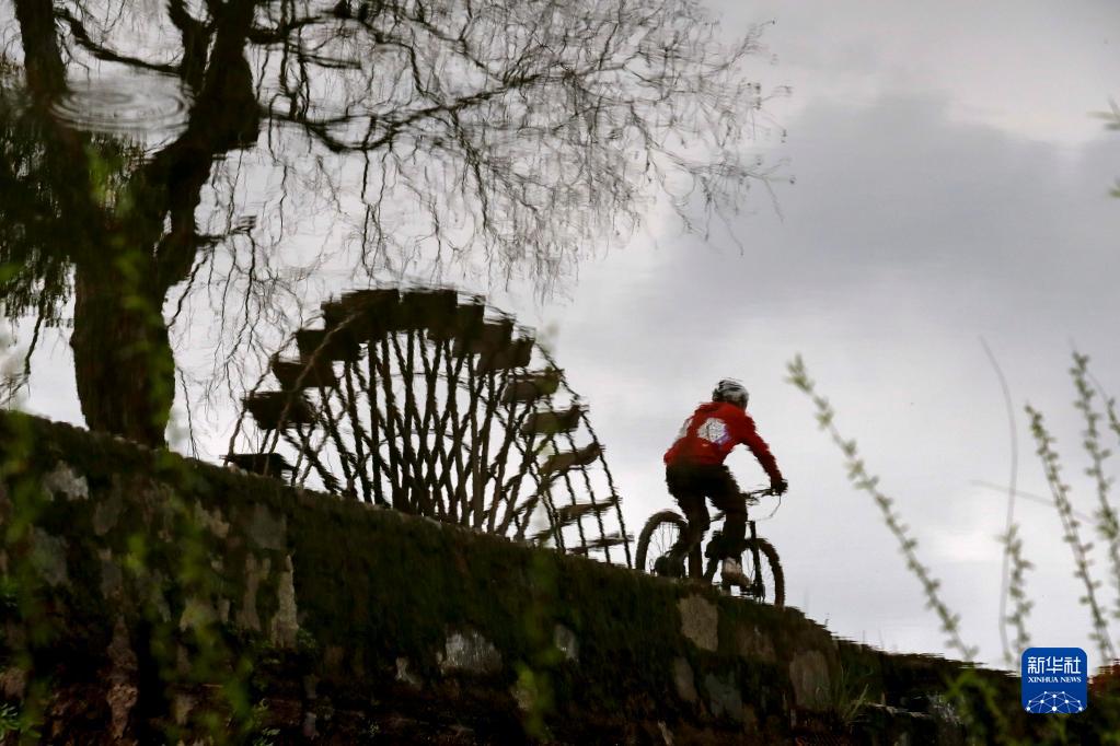 3月25日,一名车手的身影倒影在小河中(照片翻转180度)。新华社发(施亚磊摄)