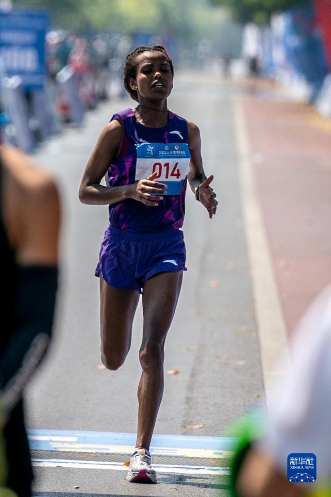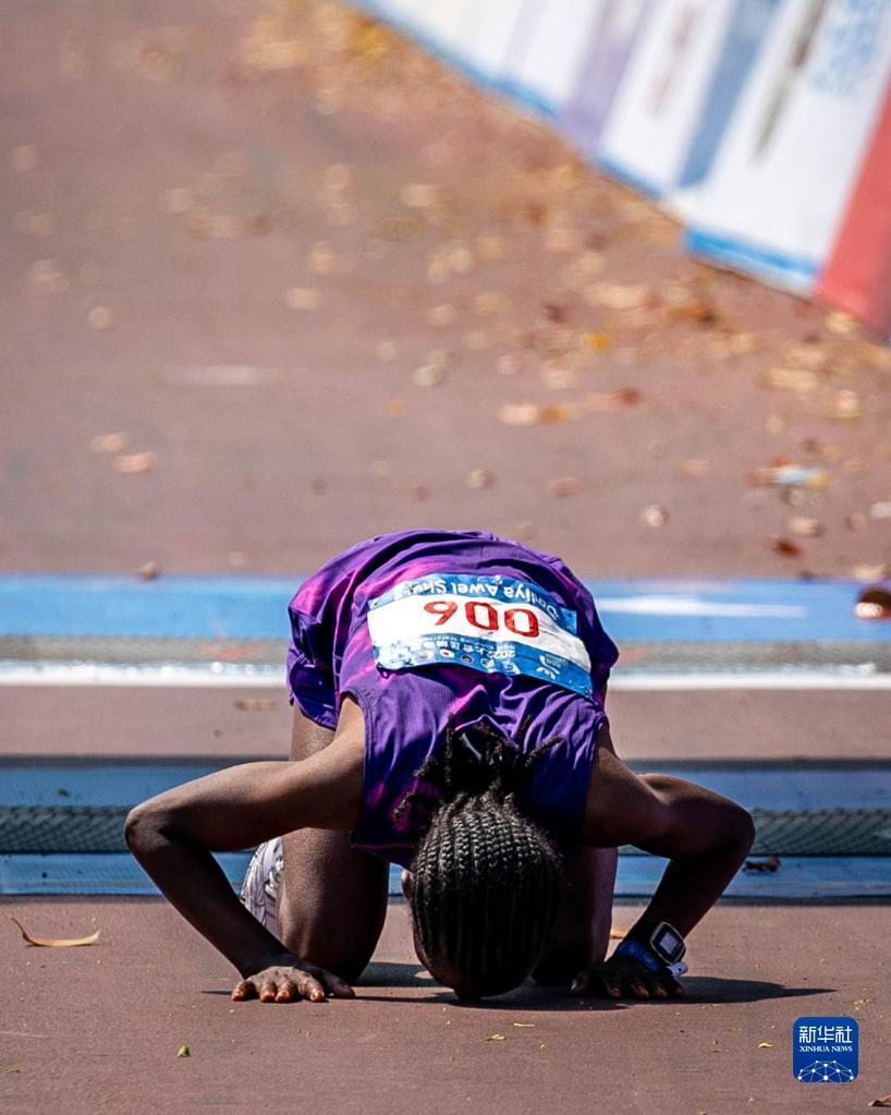 3月26日,埃塞俄比亚选手舒尔冲过终点后。她以2小时34分49秒的成绩获得女子全程马拉松冠军。新华社记者 胡超 摄