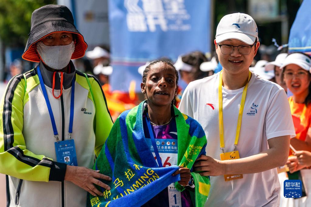 3月26日,埃塞俄比亚选手舒尔(中)冲过终点后。她以2小时34分49秒的成绩获得女子全程马拉松冠军。新华社记者 胡超 摄