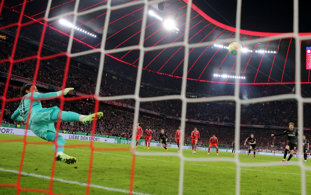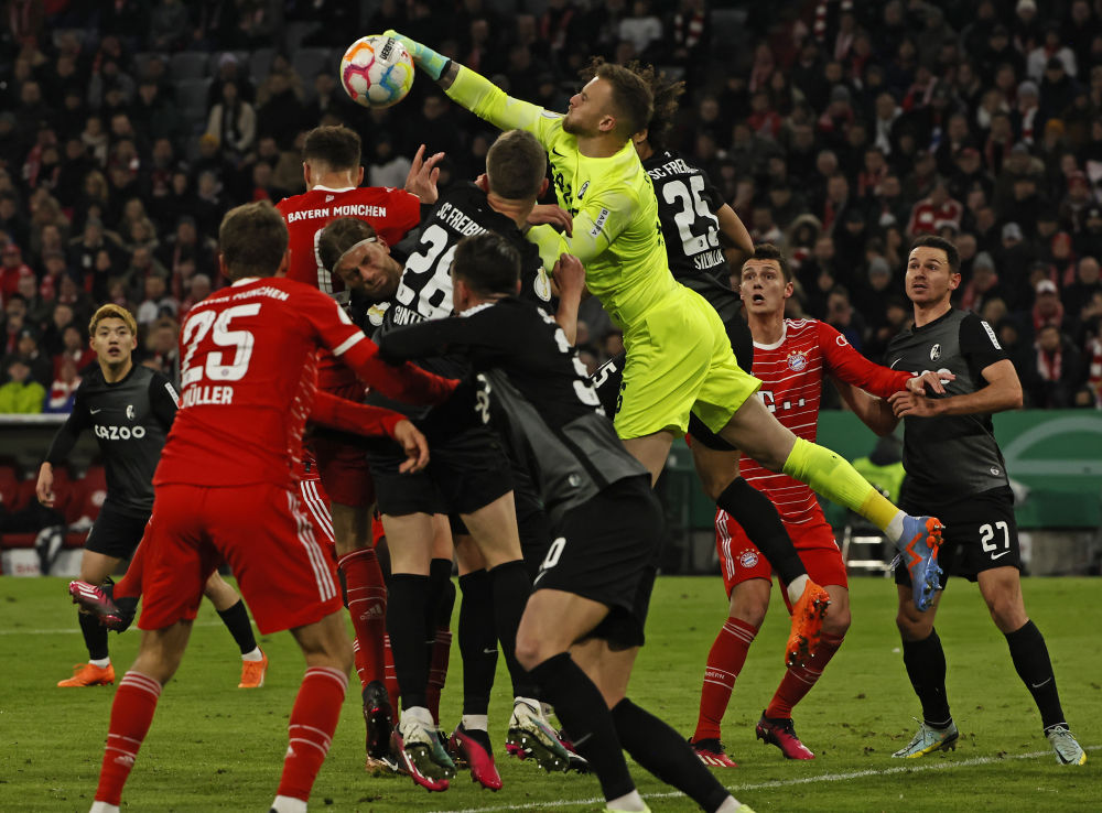 易边再战,伤停补时阶段,穆夏拉禁区内手球犯规,裁判判罚点球。弗赖堡前锋霍勒主罚一蹴而就,绝杀拜仁。