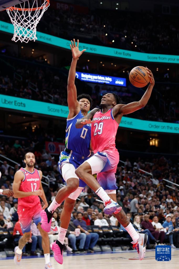 4月4日,奇才队球员杰克逊(右)在比赛中上篮。新华社发(沈霆摄)