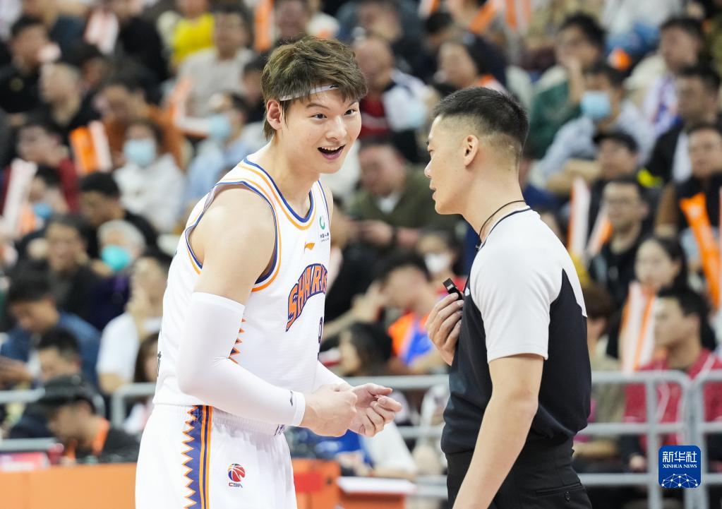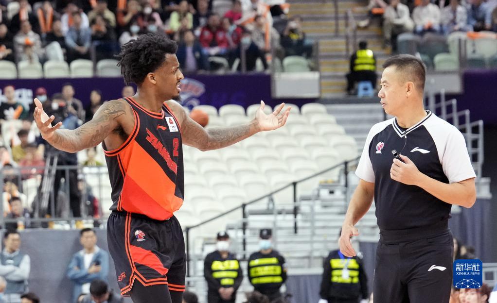 4月9日,上海久事队球员王哲林(左)在比赛中与裁判交流。新华社记者 丁汀 摄