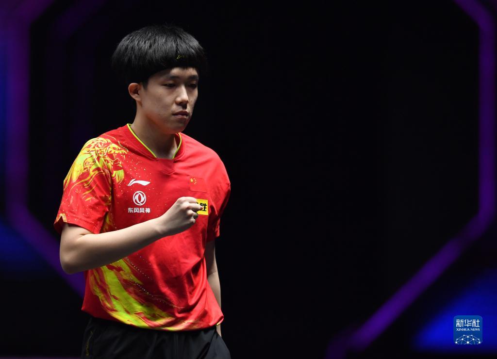 4月10日,王楚钦在比赛中庆祝得分。新华社记者 李嘉南 摄