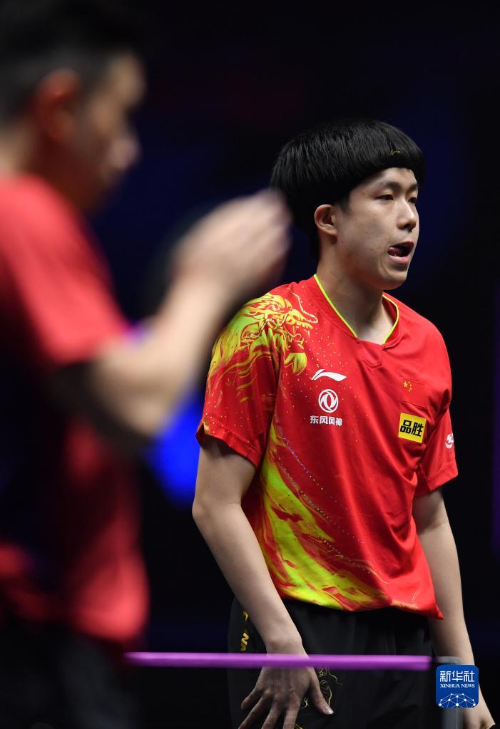 4月10日,王楚钦(右)在比赛中回球失误后。新华社记者 李嘉南 摄