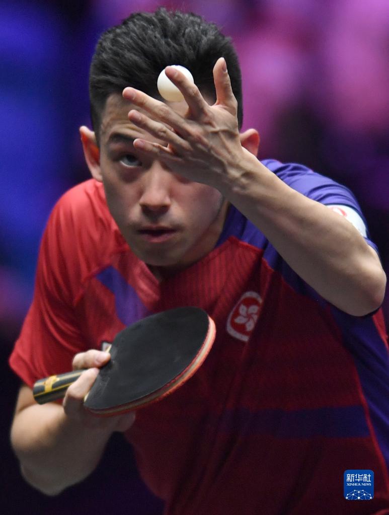 4月10日,王楚钦在比赛中发球。新华社记者 李嘉南 摄