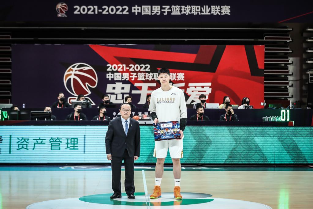 3月2日,获评月度最有价值球员的广厦队球员胡金秋(右)在赛前领奖。新华社记者潘昱龙摄
