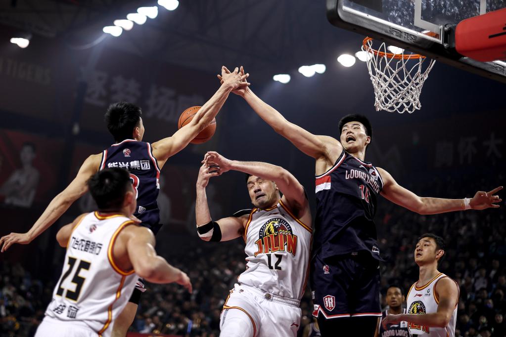 4月5日,龙狮队球员焦泊乔(右上)与吉林队球员钟诚(中)争抢篮板球。新华社记者许畅摄