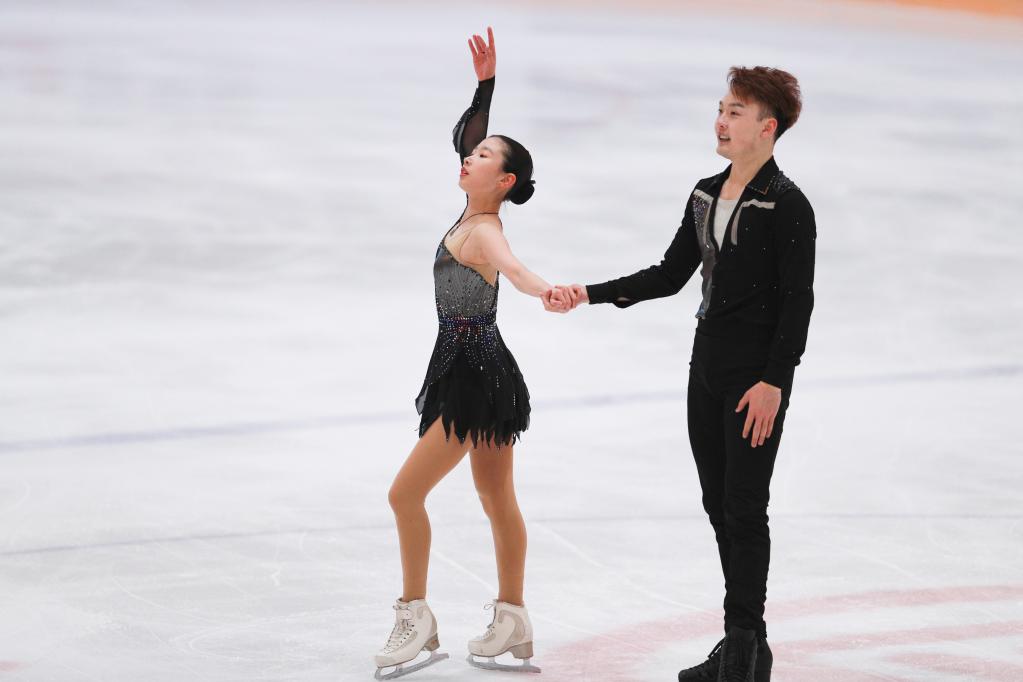 4月12日,黑龙江省冰上训练中心选手张思阳(左)/杨泳超在双人滑短节目比赛后致意。新华社记者 许雅楠 摄