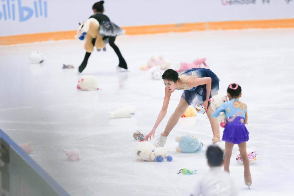 4月12日,内蒙古自治区冬季项目运动中心选手陈虹伊(左二)在女子单人滑短节目比赛后拾起场内的毛绒玩具。新华社记者 许雅楠 摄