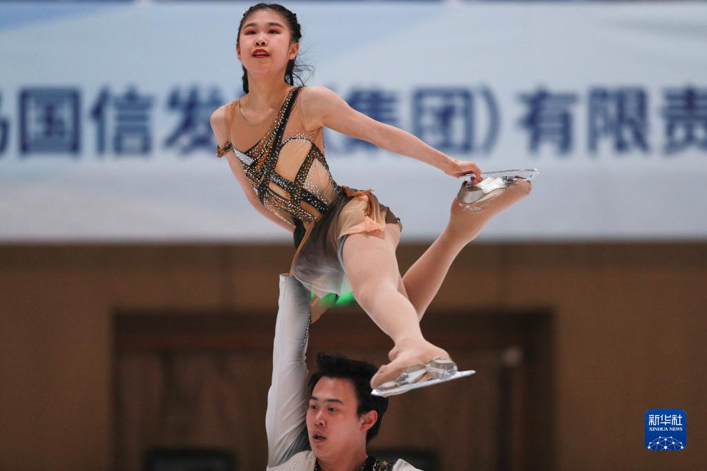 4月13日,齐齐哈尔市冬季运动项目中心选手张嘉轩(上)/ 黄一航在双人滑自由滑比赛中。最终,他们以156.34分的总成绩获得亚军。新华社记者 许雅楠 摄