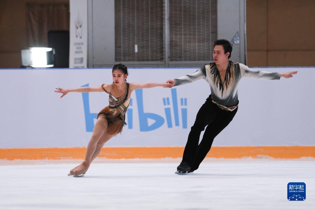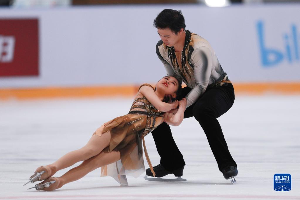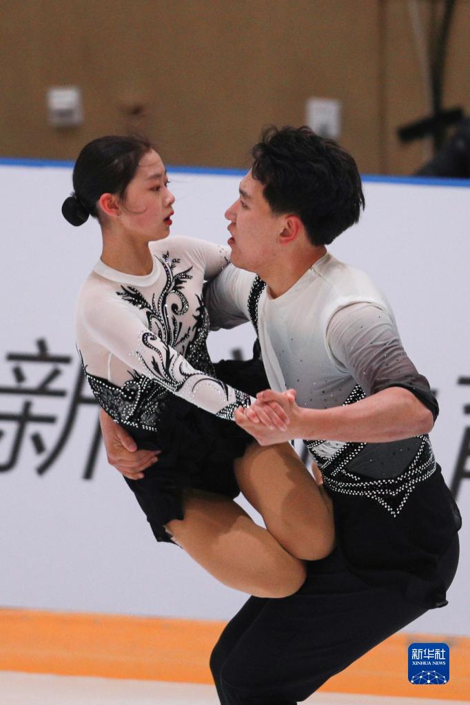 4月13日,黑龙江省冰上训练中心选手赵婉彤(左)/刘宇航在双人滑自由滑比赛中。最终,他们以146.09分的总成绩获得季军。新华社记者 许雅楠 摄