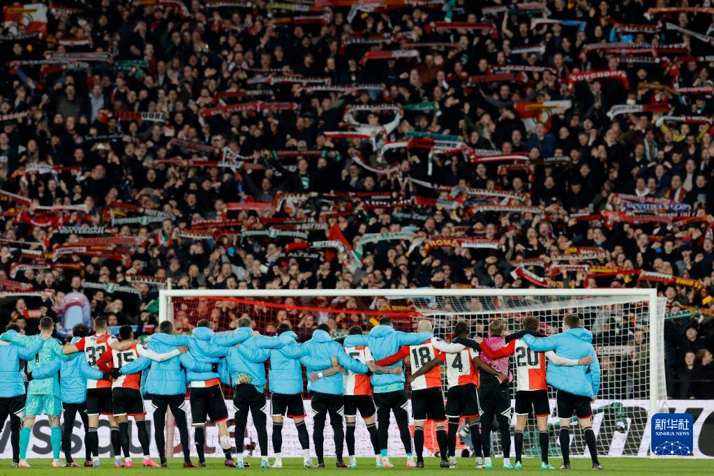 4月13日,费耶诺德队球员在赛后和球迷一起庆祝胜利。新华社/路透