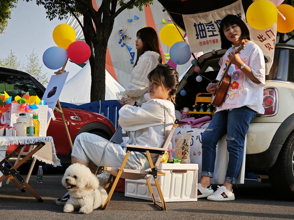 “后备箱集市”摊主在赛场外。新华社记者王沁鸥摄
