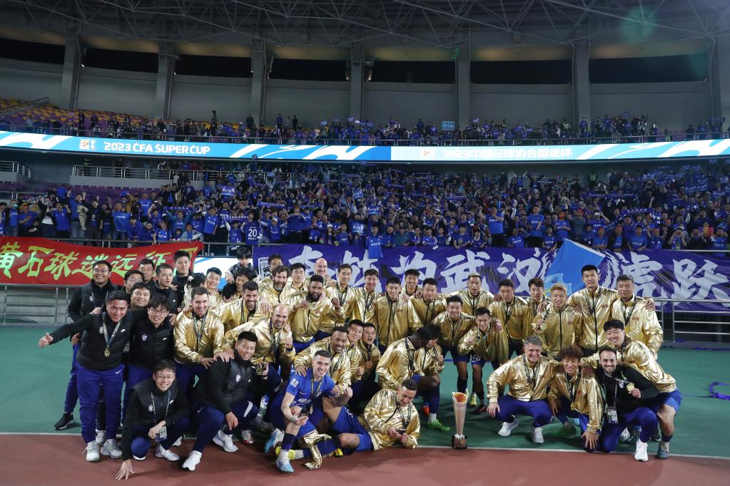 4月8日,武汉三镇队成员在2023中国足协超级杯比赛颁奖仪式后合影。新华社记者 贾浩成 摄