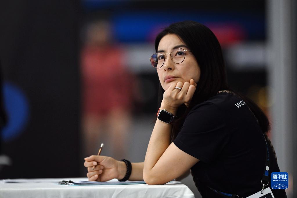 当日,在西安奥体中心游泳跳水馆,世界泳联跳水技术委员会委员、跳水世界冠军郭晶晶现身2023年跳水世界杯西安站。