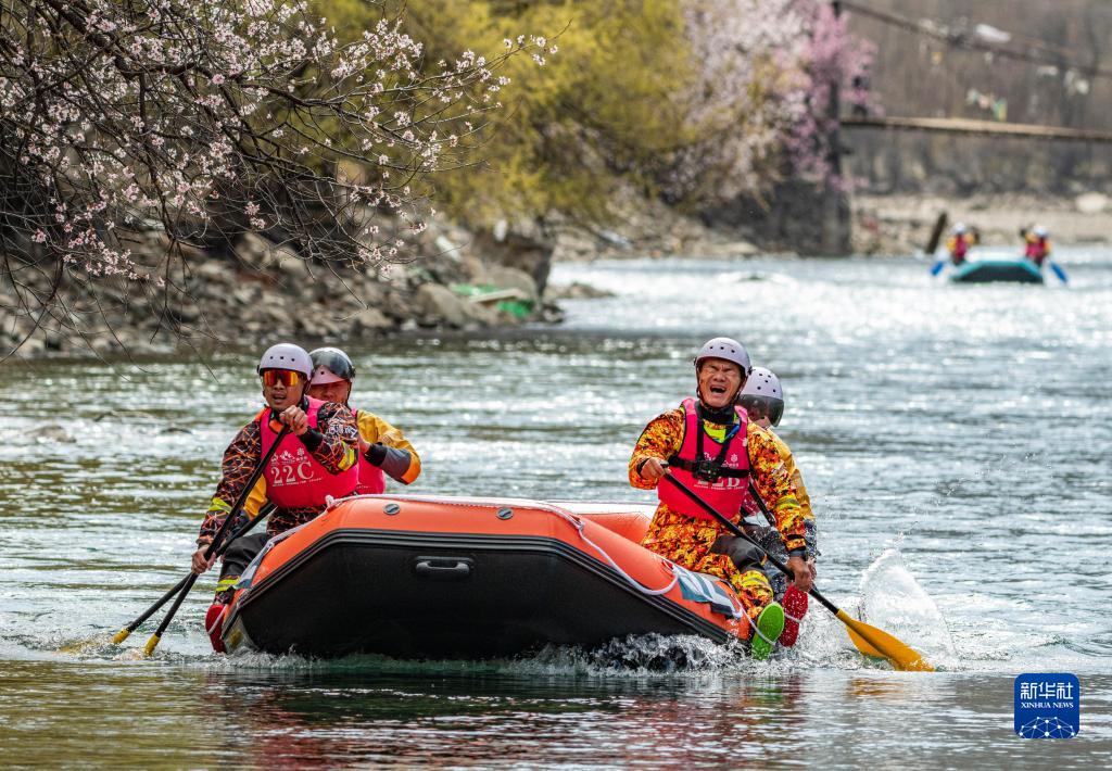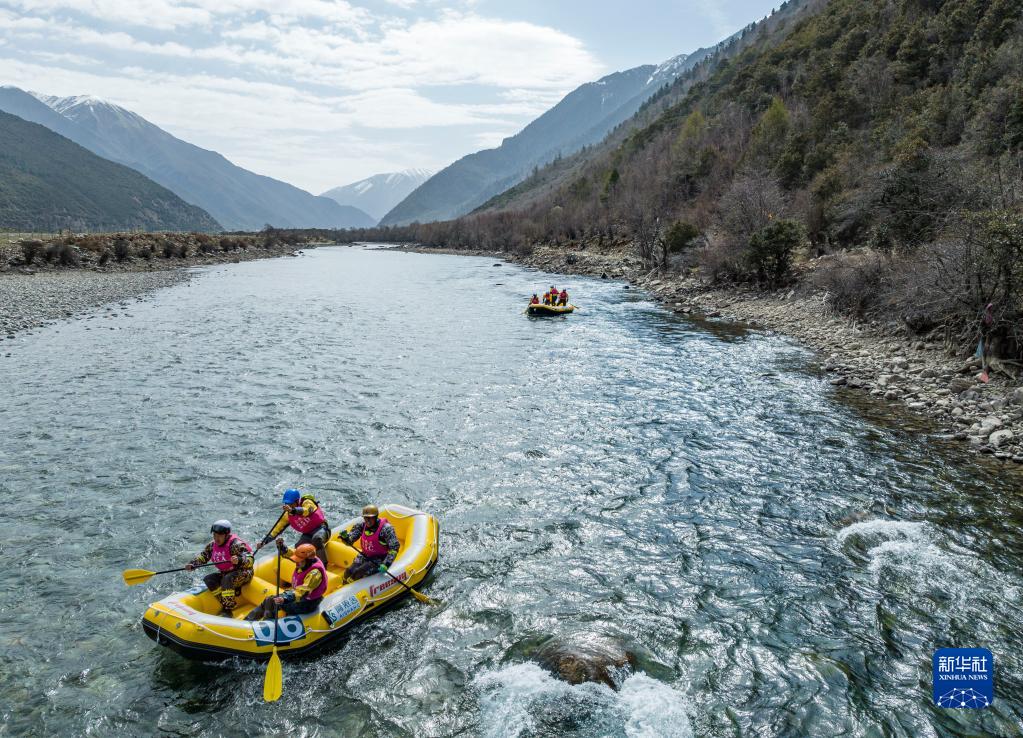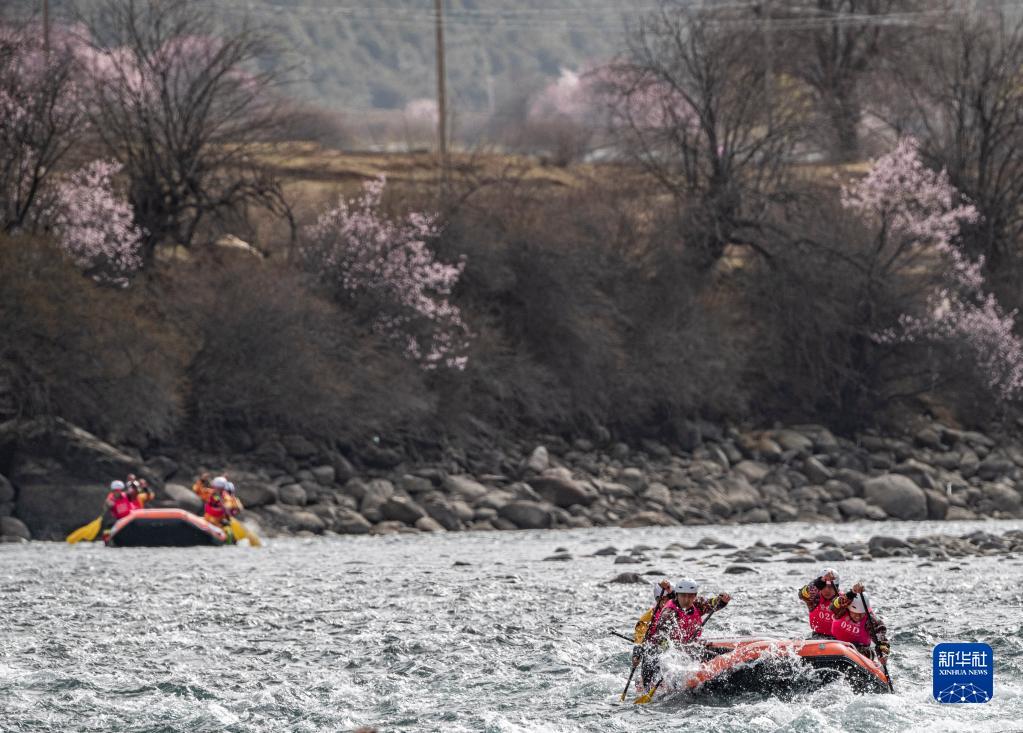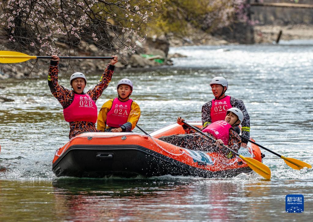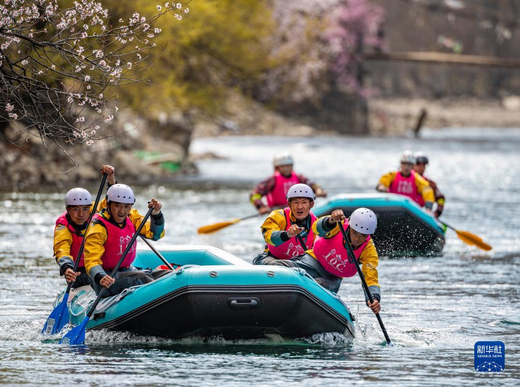 4月16日,西藏旅游股份有限公司漂流队(前)在激流漂流筏追逐赛中。最终,他们获得亚军。