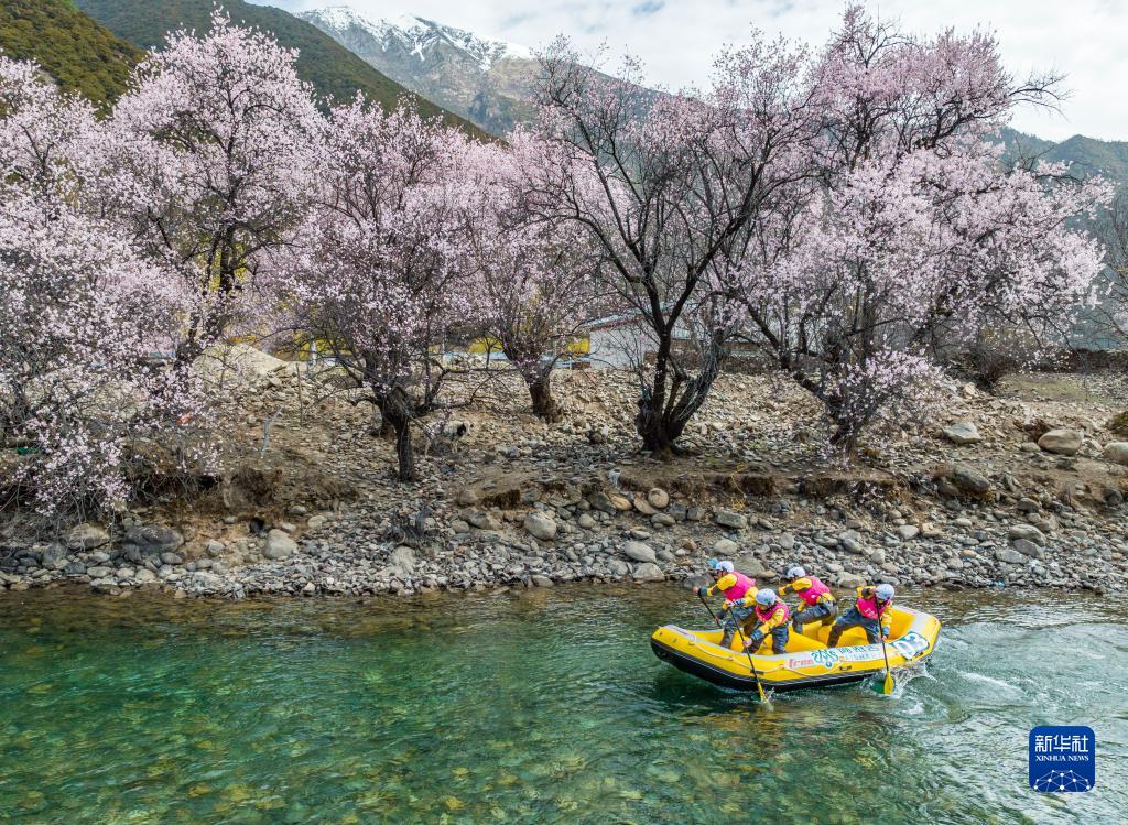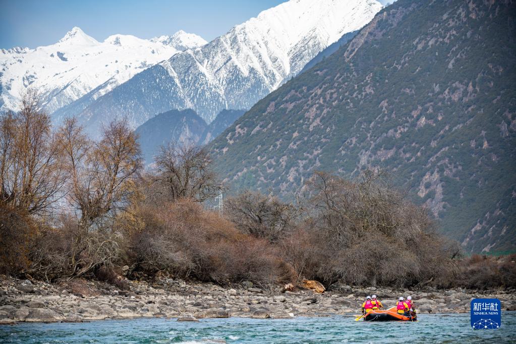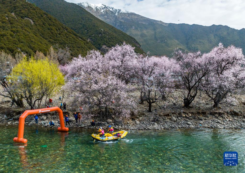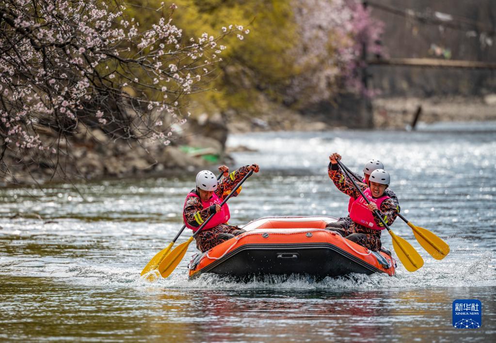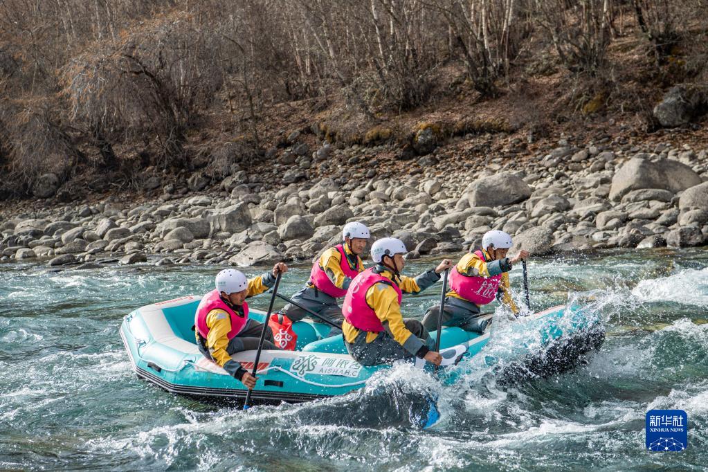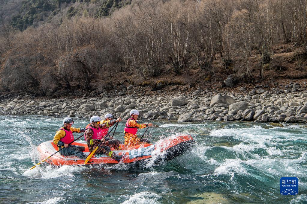 4月16日,西藏旅游股份有限公司漂流队(前)在激流漂流筏追逐赛中。最终,他们获得亚军。