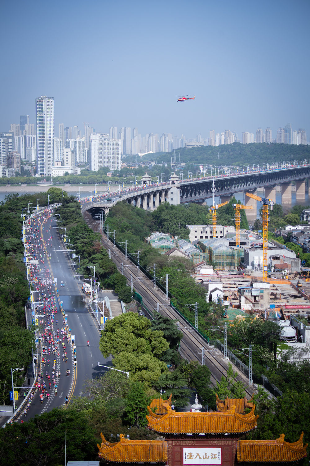 4月16日,参赛选手经过长江大桥。新华社记者 伍志尊 摄