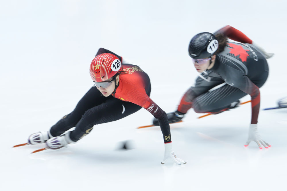 2023年2月12日,世界杯多德雷赫特站:中国队获得女子3000米接力季军,图为中国队选手王欣然(左)在比赛中。新华社记者郑焕松摄