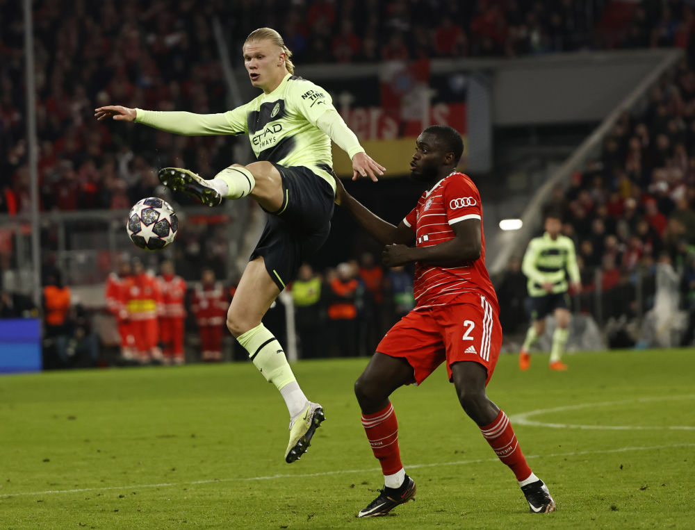 首回合曼城主场3:0击败拜仁,将对手逼入绝境。次回合上半时第18分钟,曼城球员哈兰德形成单刀球机会,被于帕梅卡诺绊倒,主裁判直接出示红牌,随后经视频助理裁判(VAR)确认,哈兰德处于越位位置,红牌取消。第35分钟,曼城的京多安突施冷箭,索默将球扑出,裁判哨响,于帕梅卡诺因手球吃到黄牌,曼城得到点球机会,但哈兰德的罚球高出横梁。