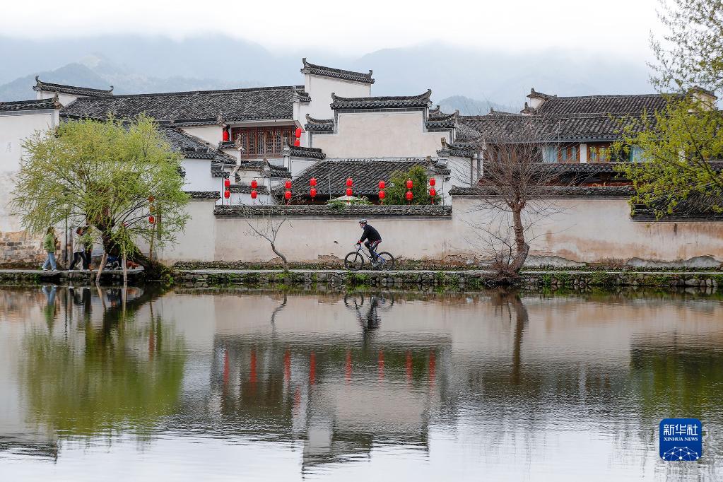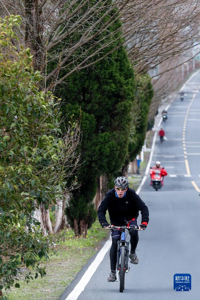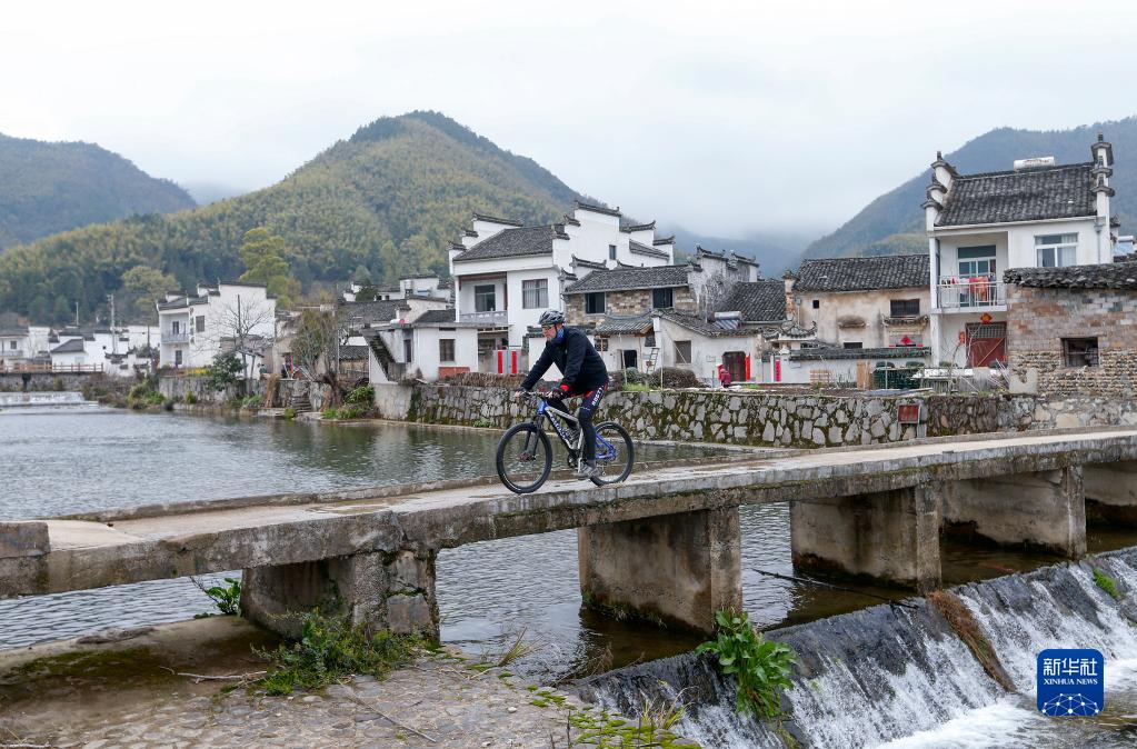 阿明在黟县宏村南湖畔小道骑行(3月23日摄)。新华社记者 杜宇 摄