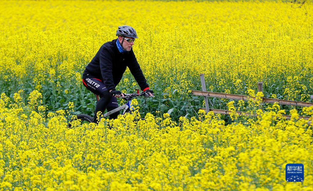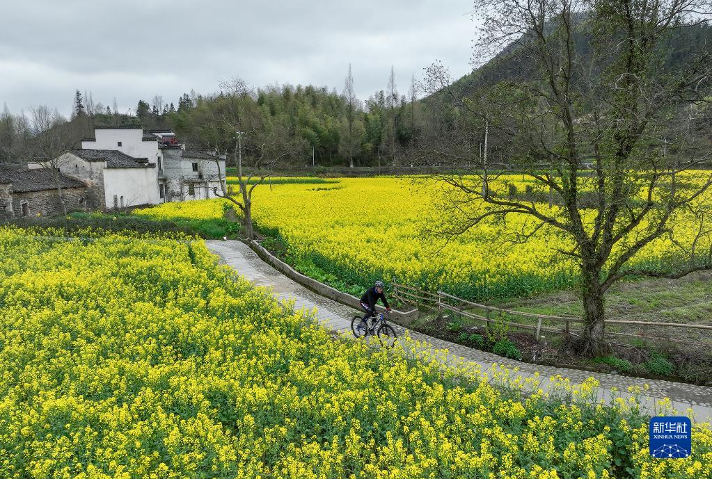 阿明在黟县油菜花田间的道路上骑行(3月23日摄)。新华社记者 杜宇 摄