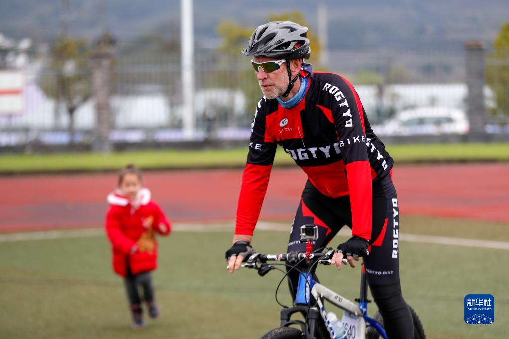 阿明在骑行中进行爬坡训练(3月23日摄)。新华社发(施亚磊摄)
