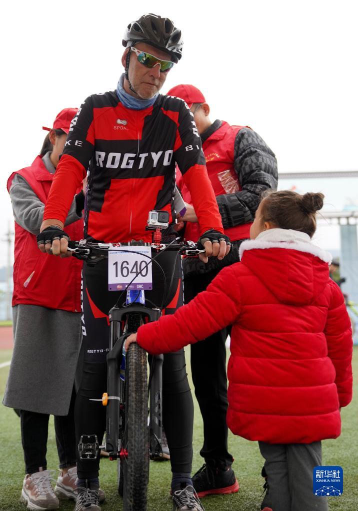 阿明(前左)在女儿阿琳娜陪伴下进行2023中国黄山(黟县)国际自行车公开赛赛前检录(3月25日摄)。新华社记者 张晨 摄