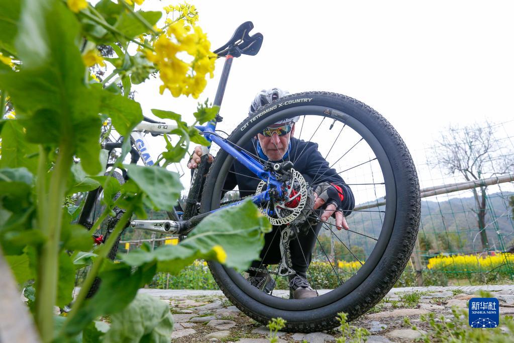 阿明在乡间道路上骑行时查看自行车状况(3月23日摄)。新华社发(施亚磊摄)